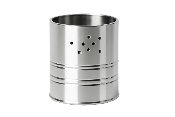 Stainless steel cutlery holder with perforated design. Perfect for organizing spoons, forks, knives, and kitchen tools.