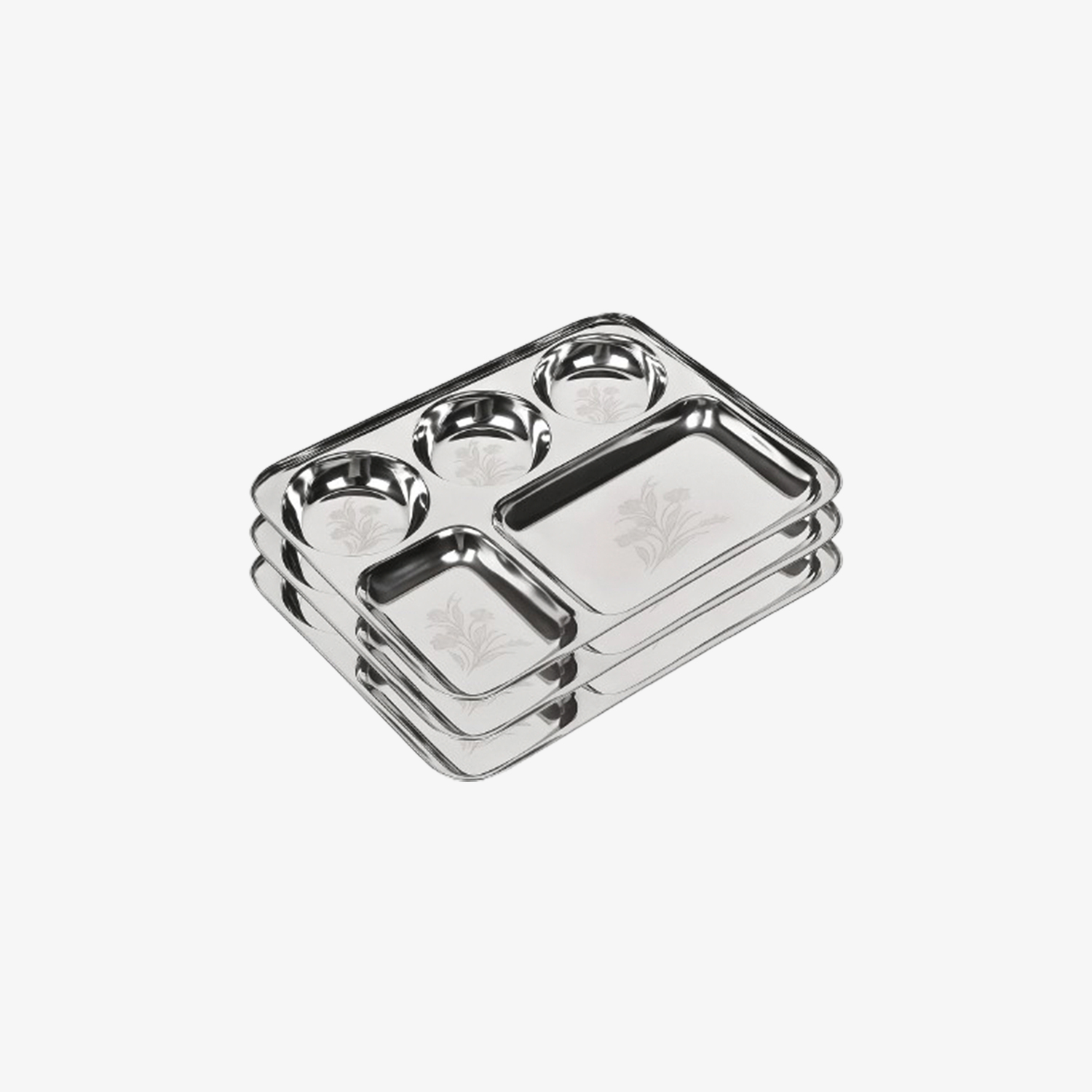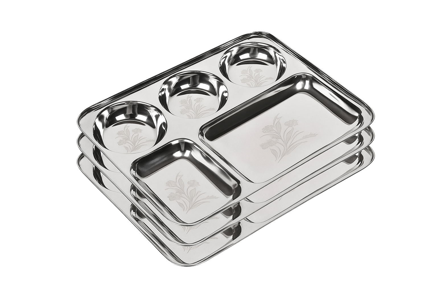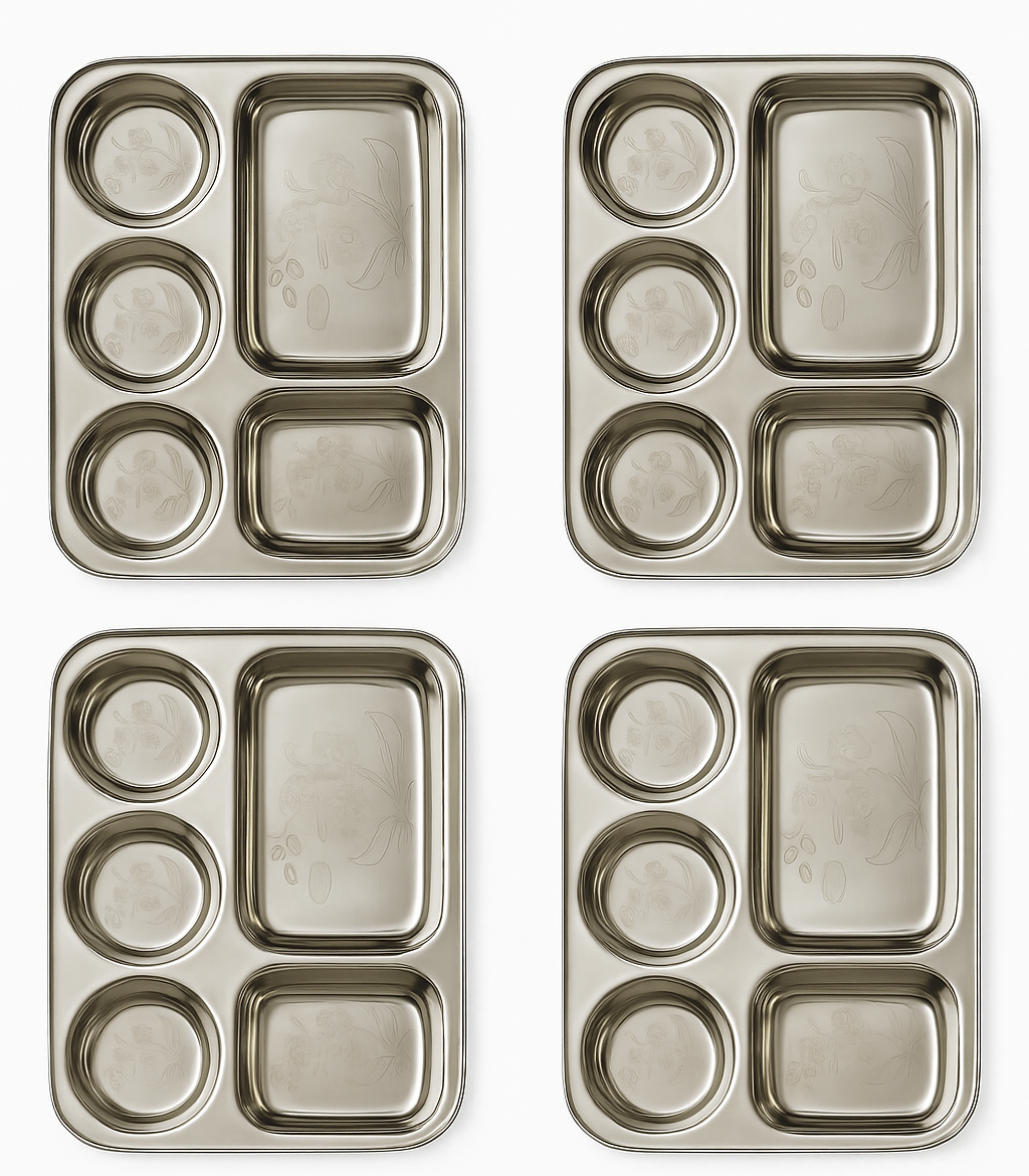 The highlight of this set is its elegant floral engraving in each section, giving the plates a graceful, artistic finish that adds charm to festive meals, religious occasions, or everyday family dining. The design is permanently etched — not painted — making it long-lasting and safe even after frequent washing.